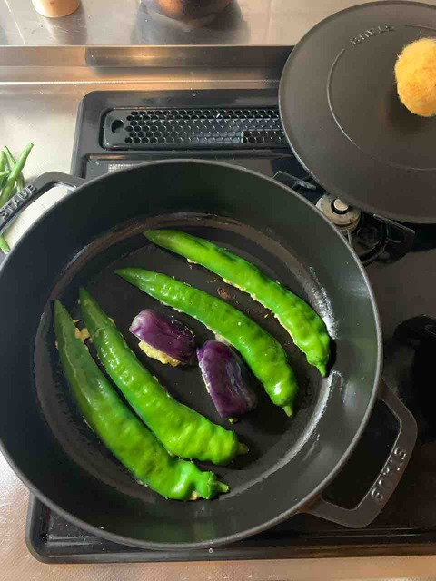 「御殿場野菜の食生活6」の続きです。まだまだ野菜も残っていたし、急に増えた休みで横浜に戻ってきて料理したのでその様子を記事にします。 甘長唐辛子と紫ピーマンに、スパイスで味付けした鶏挽肉を詰めて焼きました。 ストウブのブレイザーソテーパン28...