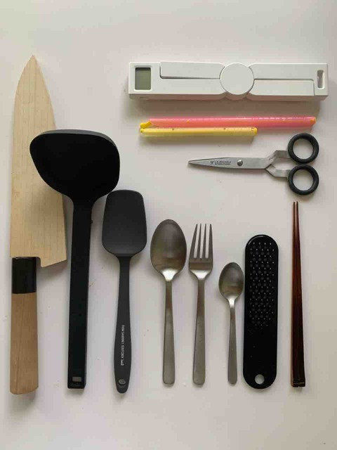 泊まりの時だけ利用する、箱根の会社の寮には、必要最低限の調理道具を置いています。 牛刀シリコンおたまシリコンスプーンカトラリー3種チーズグレーダーお箸デジタルスケールエニーロックはさみ プラスチックの細長い収納容器に収めています。 この他、... -