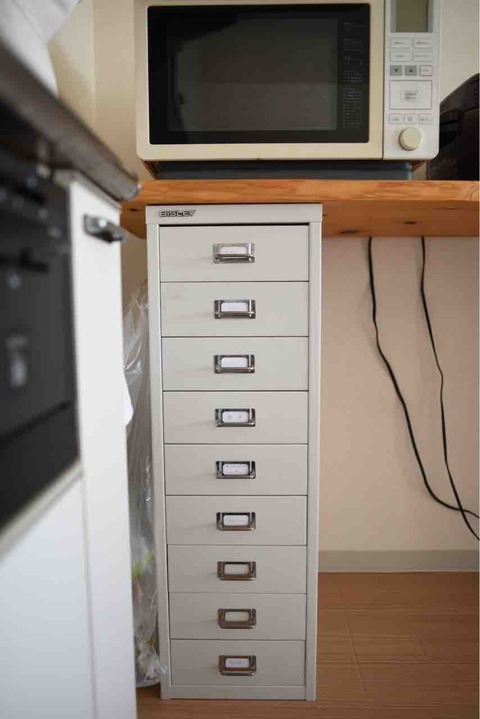 家のキッチンは、7畳くらいの広い部屋になっています。ワークトップは十分に広くて使いやすいです。 横には、Bisley ビスレー という、スチール製の抽き出しを2つ置いて、その上に無垢の板を渡して台にしています。無垢の板は、自分でヤスリを掛け、オイル... -