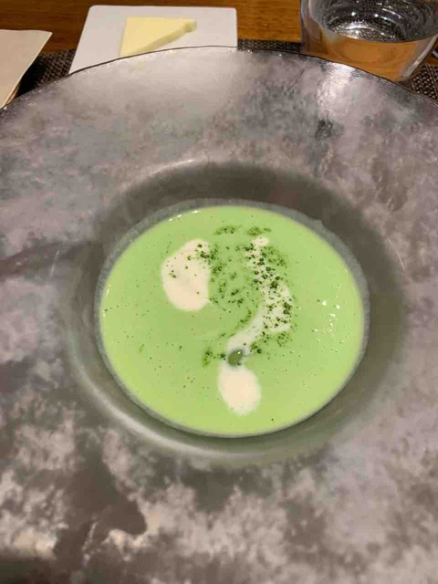 東京ジャーミィに行ったついでに、フレンチ料理店「ラ・ファソン古賀」でランチを取りました。 ランチコースはスープ・サラダ・メイン に食後のデザートと飲み物付きでした。 まずは冷製グリーンピーススープ 新玉ねぎのクーリ グリーンピースの豆の香りが... -