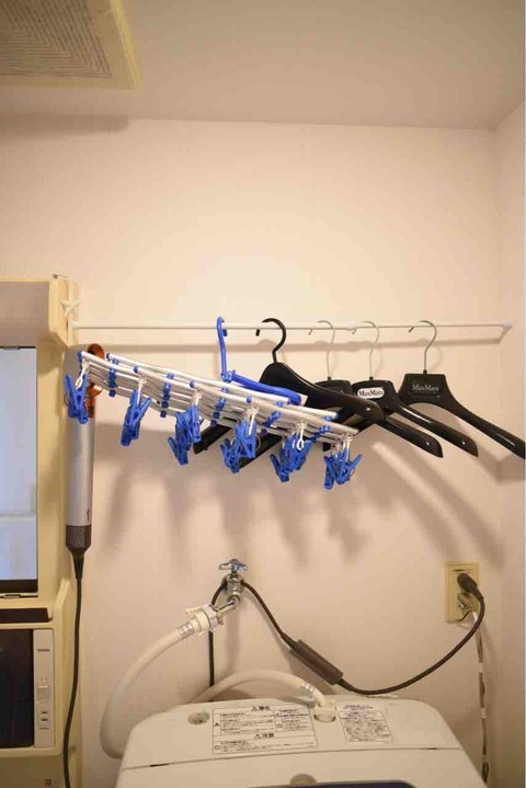 洗面所には、洗濯用ハンガーを吊すところがなかったので、突っ張り棒を買ってきて付けました。 洗面台には、以前ドアフックとして使っていた金具を引っ掛けて、そこにダイソンのエアラップスタイラーを吊り下げました。ヒョイと手に取れてすごく便利です。...