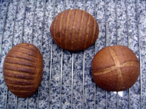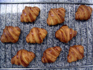 前回、私は成形の最後で大失敗した。というのは、三角形に切り取った生地をくるくる巻くとき、打ち粉がくっついてざらざらした面が表面にでるように巻いてしまったのだ。このように雑に仕上げると、焼成時に表面がバラバラにくずれてしまうのだ。