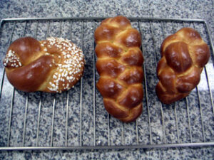 昨日のコルドン・ブルー パン基礎8回目の授業、まず最初に作ったのは「トレス」、編みパンだ。スイスでよく作られるパンだと言うことだ。昨日から機械ごねして冷蔵庫発酵しておいた生地を取り出して成形した。写真左から、1つ編み、3つ編み、2つ編み。1つ編みと2つ編みがすごく難しかった。あとこのパン、1つ1つがすごく大きいので持ち帰るのが大変だった。