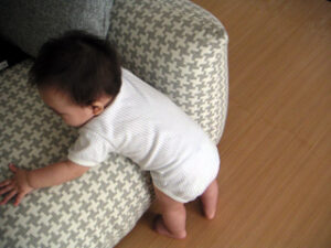 最近、はいはいみたいなのを少しずつするようになった。普通はいはいって片足を交互に動かすと思うんだけど、両足を一度に蹴り出してまるで尺取り虫のようだ。移動できるようになったので、ティッシュ箱に近づいていっていたずらしたり、新聞をグチャグチャにして引き裂いたり、椅子の下に潜り込んで出られなくなって泣いたりするので目が離せない。