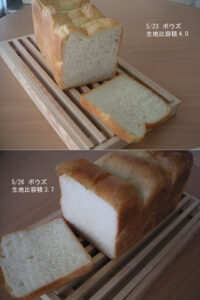私もボウズが悲しくて必死に色々考えてみたんです。まずは生地の量と型の体積とのバランスですね。最近の型ってどんどん大型化しているそうなので。リライブで作った食パンと家の型を比べてみたら確かに家の型の方が大きかったです。