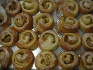 ↓先生がチャッチャッと作ったパンその2。イングリッシュマフィン用セルクルに40グラムの生地を3つ入れ、境目にバターを絞ってグラニュー糖をふった。もちもちしてすごく美味しかった。