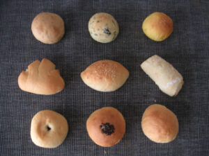 マフィンを焼くとき「上天(うえてん)」といって、セルクルの上に天板を置いて焼くのだが、今回は天板ではなく薄い銅板やステンレス板をのせて焼いてみた。天板をのせると重いから嫌なのだ。銅板をのせた方が焼き色がきれいについて窯伸びも良かったようだ。