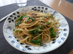 休日の昼食に、菜の花とトマトのパスタを食べました。