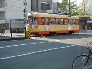 朝、路面電車で伊予鉄の松山市駅まで行きます。