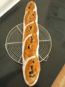 今回は、黒オリーブを入れて「パン・オ・ゾリーブ」とし、バゲットの形に成形してみました。