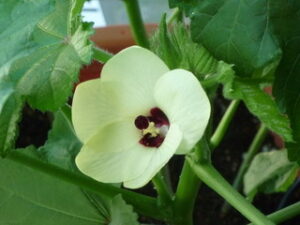 休日の朝、水やりの時にオクラの葉っぱをかき分けていたら突然目の前に大輪のオクラの花が現われました。