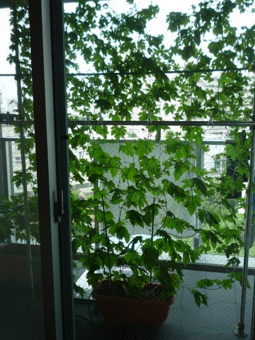 去年と同じく、縦方向の突っ張り物干しにつるものネットを張って育てています。