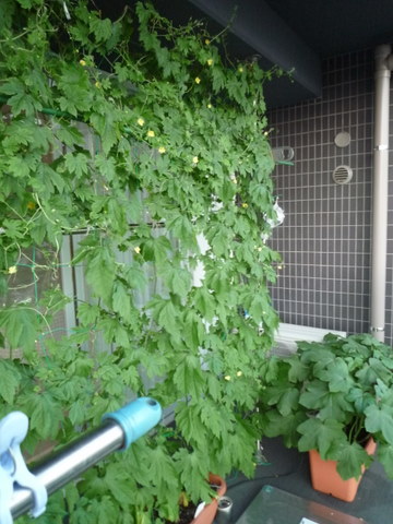 ベランダのお掃除、ゴーヤーの黄色い小さな花が散らかるのでこまめにやっています。