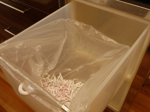 上の段の生ゴミのゴミ袋には、シュレッダーのくずを少量、敷くことに決めています。