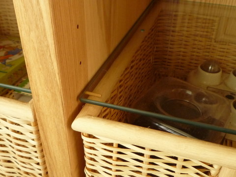 上下の引き出しの間には、使わなくて取り外していたガラス扉を棚板としてはめこみました。ダボがなかったので竹串をペンチで切って差し込みました。