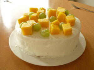 さて、今年のケーキは、ココナッツ風味のマンゴーケーキを手作りしました。