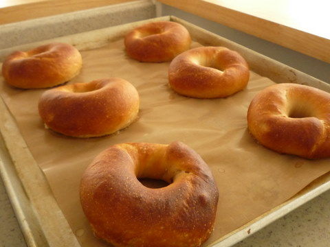 ダンチュウという雑誌に載っていた、高橋雅子先生のベーグルのレシピを参考にしました。こね上げた記事を一晩冷蔵庫で発酵させてから成形して2次発酵するやりかたです。
