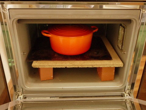 そしたらすぐコンベクションモードで150℃に予熱したミーレMieleオーブンに鍋にフタをした状態で入れて30分加熱します。