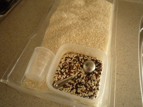 お米の上には計量カップと、らでぃっしゅぼーやの「七福豊穣米の素」を浅型のジップロックコンテナに入れて置いています。白米に混ぜて炊くためです。