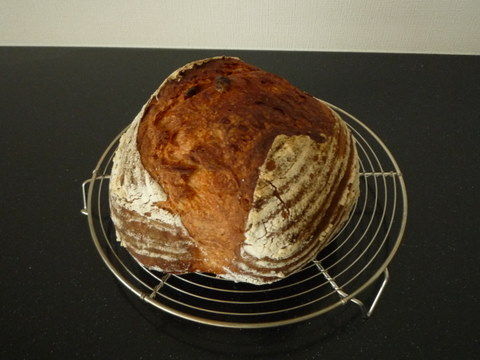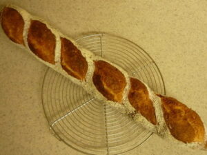 バゲットは、オビ切れしていますが、なんとか焼けました。こちらは、トラディショナル100%, ホシノ・ルバン30%, 生種10%, 給水60%くらいの配合で、一次発酵は30℃で2時間ののち、野菜室で20時間ほど寝かせました。