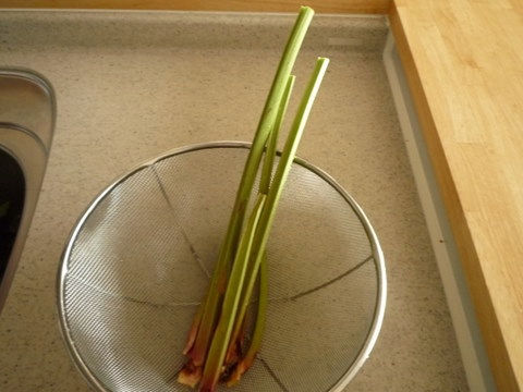 ジャムの作り方はすごく簡単で、ルバーブの茎を荒く刻んで鍋に入れ、ルバーブの重量の60%位の砂糖を振りかけて少し水分が出てくるまで放置します。その後、中火で加熱するとすぐに柔か ~くくたくたになります。適度なとろみがついたところで火を止めて出来上がりです。