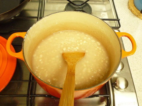 豆を煮る工程、私はミーレMieleのオーブンを使いました。ル・クルーゼのココット・ロンドに豆と水を入れてガスで沸騰させ、軽くあく取りしたらフタをしてそのままオーブンに入れて150℃で30分、余熱で1時間熱をかけました。そうしたら狙い通りの柔らかさに仕上がりました。このやりかただと鍋を見張っている必要がないため楽ちんです。