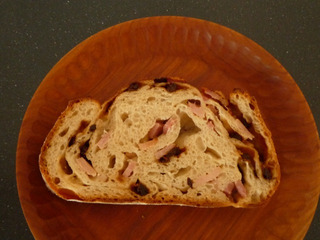 切り口は、ハムとパルミジャーノ・レッジャーノとドライトマトがギッシリ詰まっています。軽く焼いて食べたら、生地がすごく柔らかくてしっとりして食パンみたいでした(^。^)