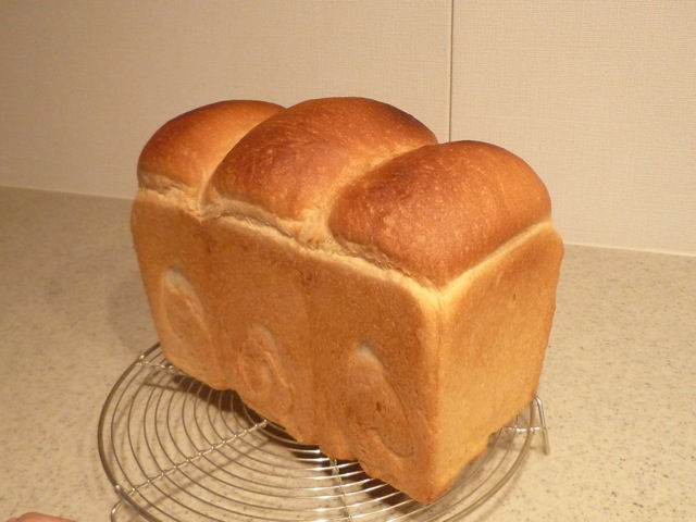 オーブンの余熱で5分、180度で5分、200度で20分、コンベクション加熱で15分と少しずつ温度を高くしていったら、いい感じに窯伸びして天井にくっつきそうになりました(゚o゚;;