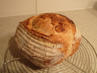 夜になって、冷たいままの生地を成形して室温(オーブンのそばの少し温かいところ)で1時間ほど2次発酵させて窯入れしました。