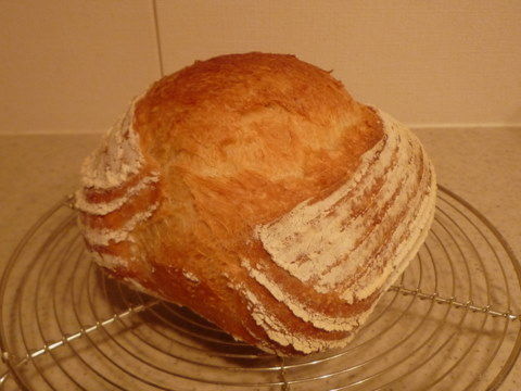 オーブンには熱湯入りバットを入れておき、十分に予熱したので、良く窯伸びしてくれました。ちょっといびつですが、元気良い焼き上がりになったので、初焼きとしては気分良いです^^