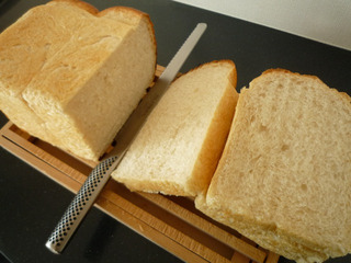 スライスしてみたら、ふんわりしっとりしておいしそうな断面でした。6枚切りにしてトーストして食べてみたら香ばしくてふわふわしていて最高においしかったです(^^)