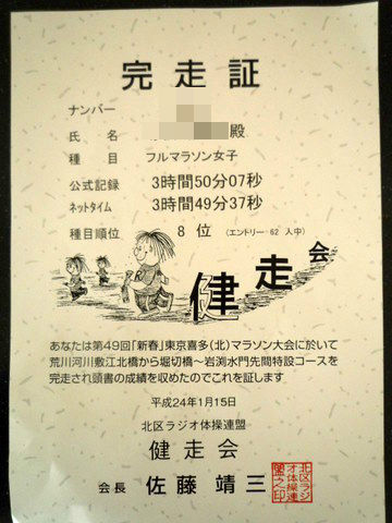 完走証です。フル(42.195km) 女子(小学以上 )でエントリーされた方62人中8位ということでした!