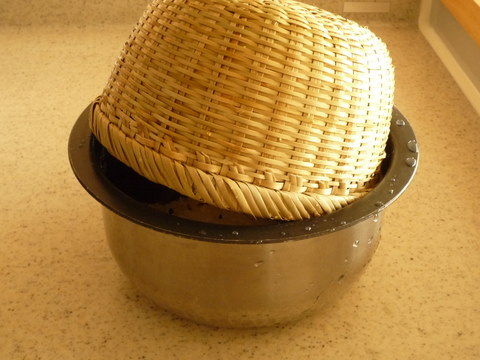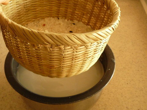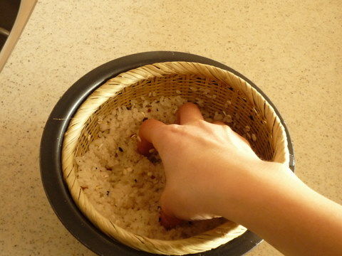 水を入れていったん切り、研ぎます。金属製のざると違って内釜への当たりがやさしいので、内釜を傷つける心配がありません。