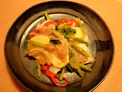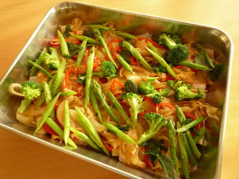 塩をなじませている間に、じゃがいも・アスパラガス・ブロッコリー・玉ねぎ・甘とうがらしの下ごしらえをしました。