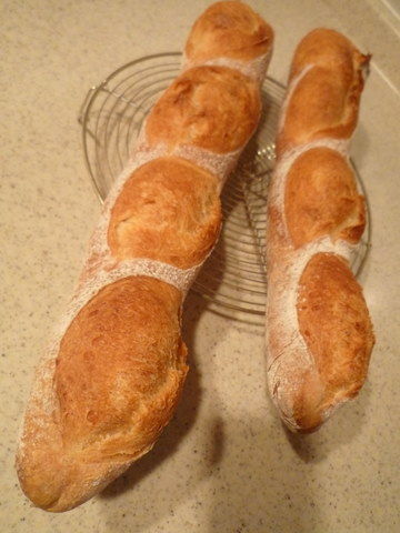 先日焼いたバゲットです。粉はゴールデンヨット30%, フランス70%, 酵母はsafインスタントドライイーストの普通生地用を0.125%使いました。給水は65%くらいでした。