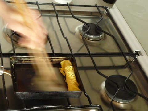 よーく熱した卵焼き器に油をたっぷりひいて、余分な油を三角折りしたキッチンペーパーでごしごし拭き取ります。それから卵液の1/3を流し入れ、巻いていきます。