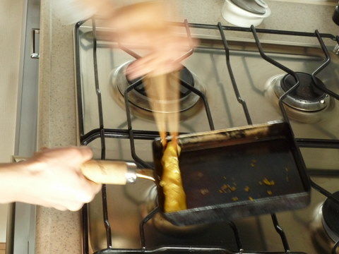 こんな風に、よく手入れした鉄の卵焼き器は、全然くっつかず、すごくおいしく作れるんです。これだから鉄の調理器具はやめられません。使うたびにワクワクドキドキします。