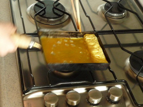 2回目の卵液を流し入れます。最初に巻いた卵の下側にも卵液が回り込むようにします。あとは最初と同じように巻いていくだけです。