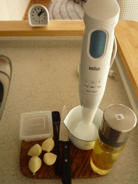 にんにく4個の皮をむいて芽を取り、菜種油をかけてマルチクイックでつぶしました。