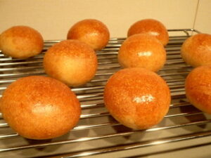 オーブンでじっくり焼いたせいか、すごくよく窯伸びしてツヤツヤふっくらと、会心の焼き上がりでした。
