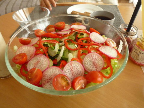 レタス、セロリ、レディーサラダ、甘とうがらし、ミニトマトを盛りつけたおいしいサラダができました。自家製タマネギドレッシングをかけたら最高です。