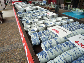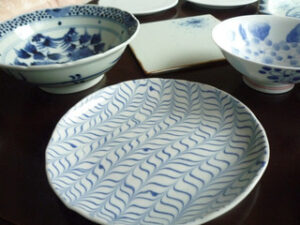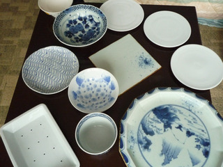 福泉窯の大きな平皿、白い水切り器、リムなしフラットなケーキ皿、そば猪口、フラットな角皿、めちゃくちゃ薄くて軽い飯碗、チョコレート模様のお皿などなど…。