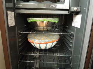 ボウルを入れた時の様子です。ワインのビンが横倒しで入る寸法なので、大きめボウルも余裕で入ります。