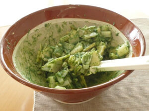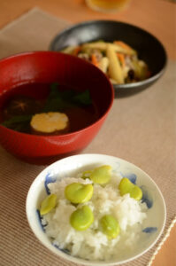 そら豆は、半量を米と合わせて炊きますが、残りの半量は八方だしでサッと煮てから炊き上がりに混ぜ込むようにしました。そのほうが色鮮やかになるかなと思いまして。