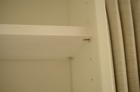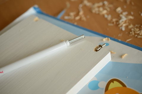棚ダボも買ってきて、それに合わせて棚板を彫刻刀で彫り込みました。