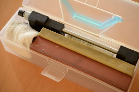 包丁研ぎに使う道具一式は、ぴったりの大きさの100円の工具箱に入れてます。