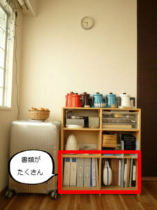 そのほか、管理規約だとか、購入時の書類だとか、果ては家電の取扱説明書など、諸々含めると収納棚の下段をすべて占有していました。