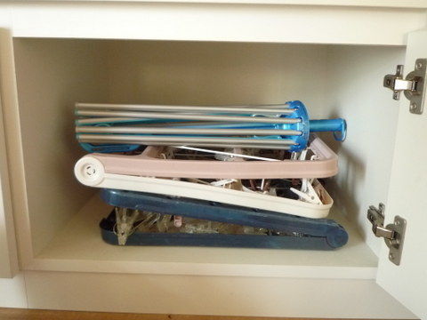 しかし、よく考えてみると、朝5時に起きてこのマルチカウンターから物干し用具を取り出して干したら、夜家に帰ってきて洗濯物を取り込んでたたむまでずっと出払っているので、この中は空っぽになっています。せっかくキッチンから一番近い場所にあるのでぽっかり開けておくのはあまりにももったいないです。3年くらいたってやっと気づきました^^;