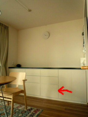 ウチは洗濯物をリビングに面したバルコニーに干すので、物干し用具はリビングのマルチカウンターのこの位置に収納していました。何しろ1日に1回は必ず使うので、一番便利な場所に置いていました。