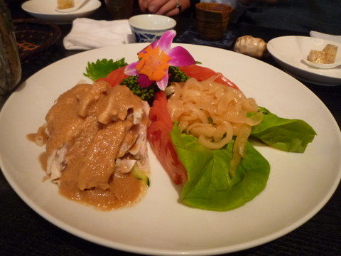 コースの前菜です。くらげの歯ごたえが絶妙で、棒棒鶏もしっとり味わい深かったです。